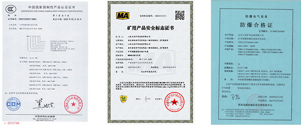 產品經國家煤礦防爆安全產品質量監督檢驗中心檢驗合格,并頒發了“防爆合格證”和安標國家礦用產品安全標志中心發放的“礦用產品安全標志證書”,以及方圓標志認證集團頒發的 中國國家強制性產品認證證書(3C)。